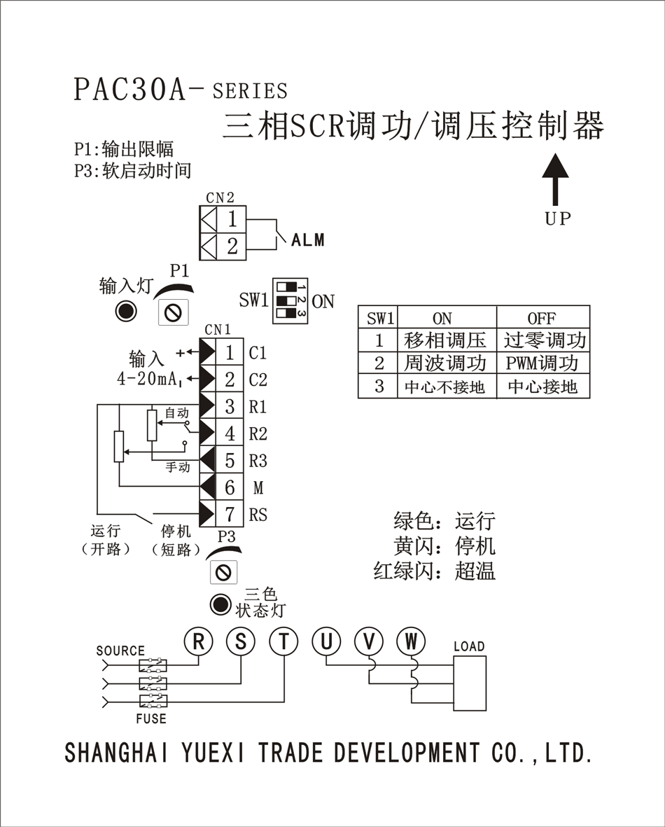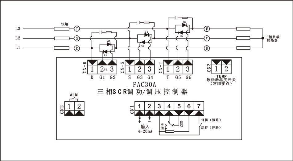 PAC30A系列:采用数字电路智能化设计,自动判别相位,力求接线简单高质量要求,低成本设计,基本达到固态继电器的整机成本,同时弥补了固态继电器的缺陷,使PAC30A的功能达到了:调功/调压任意设定,初次上电具有缓启动,手动/自动调节输出,输出限幅、负载中心接地或不接地任意设置,特殊电压及频率可选等。